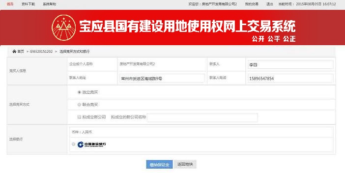 竞买人通过数字CA证书登录系统后,可以选择相应的地块进行申请竞买,浏览相应的土地出让公告信息,具体报名时可以是独立竞买或联合竞买两种方式。