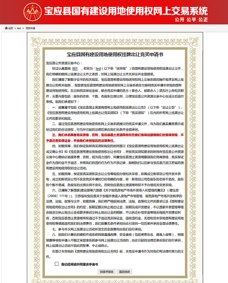 第十五条 网上交易只接受网上竞买申请,不接受其他形式的申请。竞买申请一经提交,即视为对出让公告、出让须知等出让文件的相关信息无异议并全部接受。