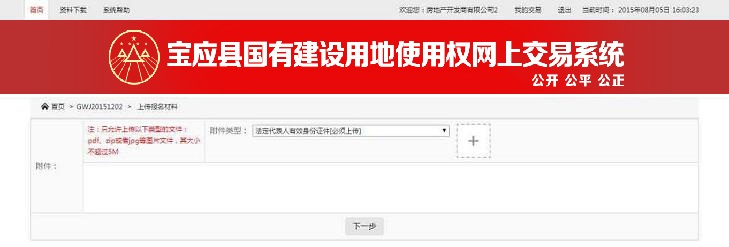 10)竞买人上传报名附件材料,点击【下一步】,如下图: